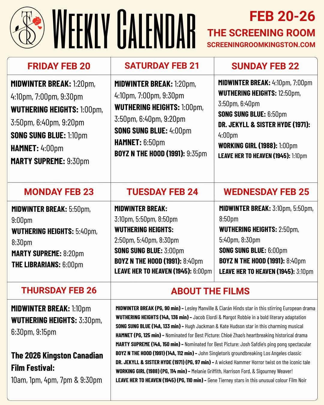 Showtimes "Wuthering Heights" | 12:50PM, 3:50PM, 6:40PM Working Girl (1988): A Popcorn & Purls Craft-Along Matinee | 1:00PM Leave Her to Heaven (1945) | 1:10PM Dr. Jekyll & Sister Hyde (1971) | 4:00PM Midwinter Break | 4:10PM, 7:00PM Song Sung Blue | 6:50PM