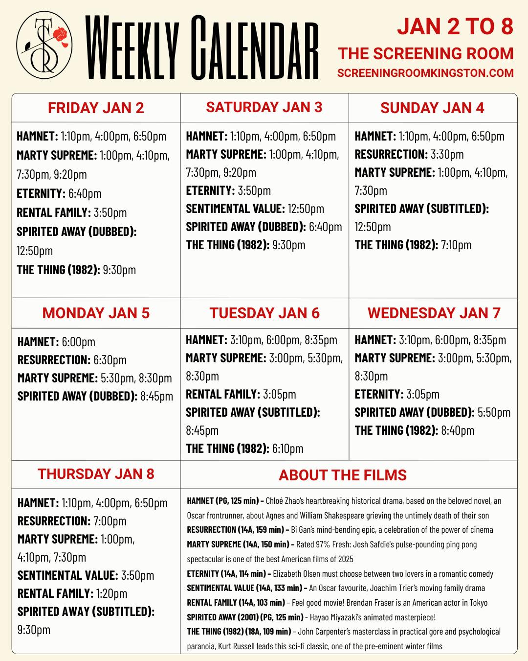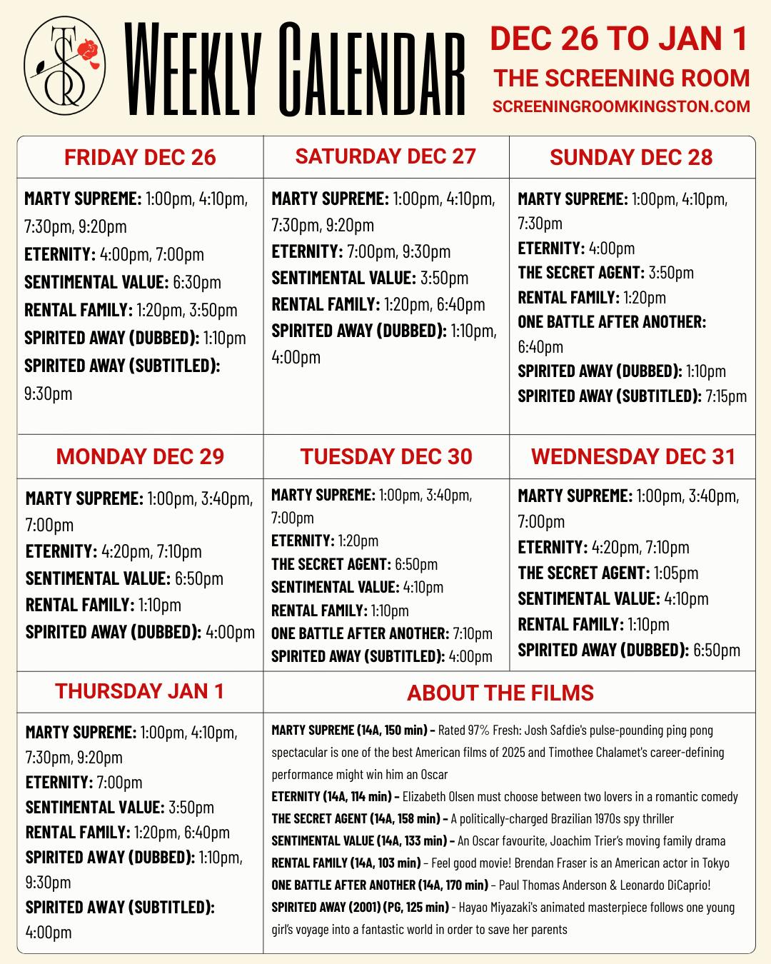 Announcements Vintage poster exhibit on display: Is it a Christmas movie? - | All events hosted by The Cinema Society of Kingston - | Now Playing: Marty Supreme - | Opens January 2: Hamnet - | Opens January 16: The Choral -